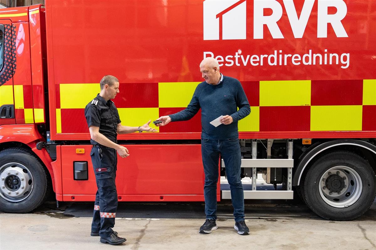 Thorbjørn Hitland overleverer bilnøkkelen til brannsjef Sindre EgenessRVR står for restverdiredning, og handler om å berge det som fortsatt kan reddes, enten det er familiebilder, viktige dokumenter, uerstattelige gjenstander, inventar eller bygningsdeler. Bilen er utstyrt med bl.a. pumper, vifter, strømaggregat og flomvernmateriell, og er klar til innsats 24/7 hele året.