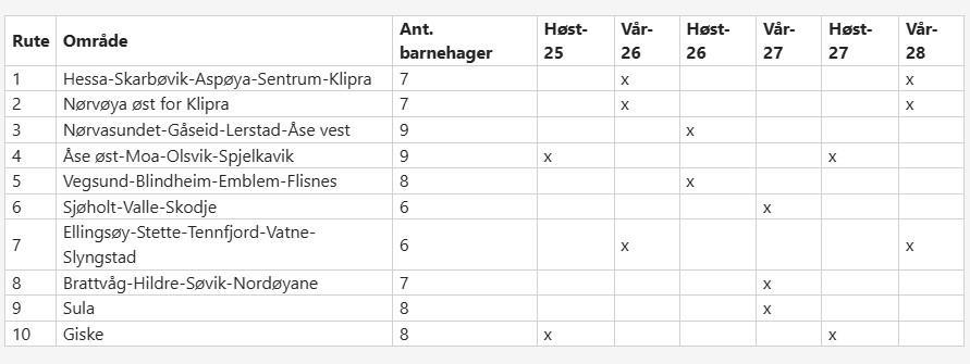 Vi har som målsetting å besøke alle de 80 barnehagene i vårt område hvert 2. år, dvs. rundt 40 barnehager hvert år. Vi følger en fast kjøreplan, slik at alle våre rundt 80 barnehager får besøk. Dere får beskjed fra oss i god tid før vi kommer!